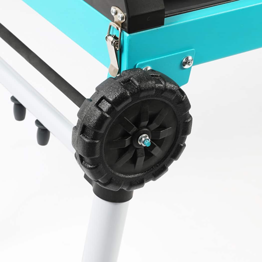 Daarnaast biedt de werktafel meerdere hoogte-instellingen (560, 613, 665, 717 en 770 mm). Daardoor kunt u altijd een ergonomische werkhoogte kiezen. Verder zorgen de stevige poten voor uitstekende stabiliteit, zelfs wanneer u aan zware tegels werkt. Ook helpen de hoogwaardige wielen u om de tafel probleemloos naar een andere werkplek te rollen, wat tijd bespaart tijdens grotere projecten.